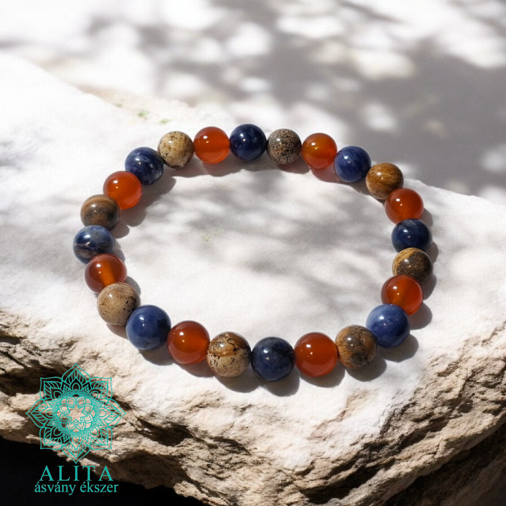 Kos csillagjegy-szodalit-karneol-képjáspis 8 mm ásvány karkötő